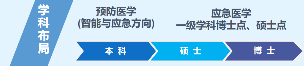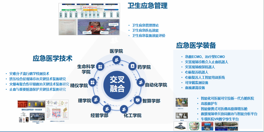 构建“卫生应急管理+应急医学技术+应急医学装备”交叉学科体系,融合智能医学工程、卫生应急管理、应急医学技术等方向,实现“医工理管”多学科深度渗透,打造应急医学领域的“学科航母”。