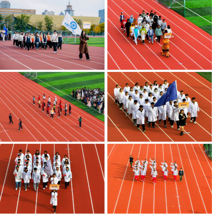 上午8时30分,运动会开幕式在热烈的掌声中开始,各运动员代表队方阵入场。医学试验班新生代表方队率先入场,整齐划一的动作配上精彩纷呈的表演,展现了青春活力。随后入场的是医学院、药学院、卫生应急学院、生命科学学院的高年级代表队,他们身着实验服和白大褂,意气风发地走过主席台。