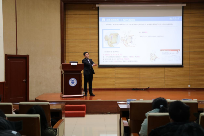 开幕式后,董文龙为参加活动的师生带来了以《高质量心肺复苏解析与实施+海姆立克》为主题的理论课讲解。课程内容深入解析了心肺复苏和海姆立克急救法的科学原理和关键步骤,帮助师生系统了解相关理论知识,为后续的实操课程打下了坚实基础。