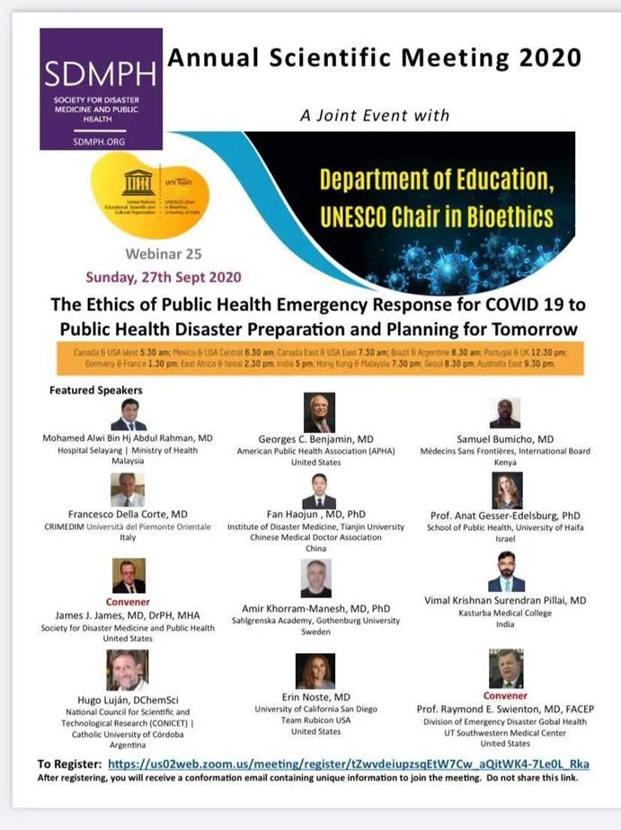 9月27日,天津大学医学部灾难医学研究院副院长樊毫军教授受邀参加联合国教科文组织的灾难医学和公共卫生协会(SDMPH)线上研讨会,本次会议主题为“新型冠状病毒疫情的医学伦理”。来自以色列、马来西亚、美国、肯尼亚、意大利、中国、瑞典、印度、阿根廷等国家的12位专家学者在会上做了交流发言,樊毫军是来自中国的唯一代表。