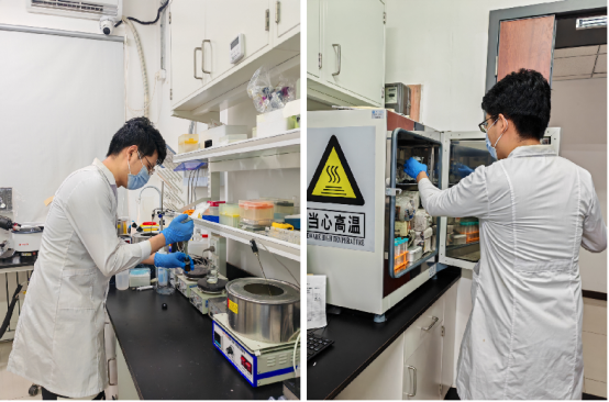2023级博士生杨欣燃和2022级硕士生罗少焓正在进行不可压迫性伤口止血材料制备实验