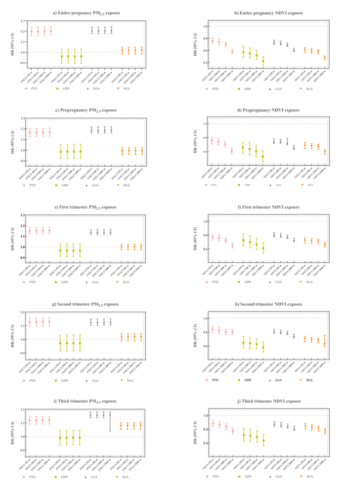 250 m缓冲区,全孕期PM2.5浓度每增加10 μg/m³, PTD风险增加19.8% (HR:1.198, 95%CI: 1.158 ~ 1.239)LGA风险增加20.7% (HR:1.207, 95%CI: 1.177 ~ 1.239)。相反,绿地暴露与不良妊娠结局风险降低显著相关。全孕期NDVI每增加0.1个单位,PTDLBWLGASGA的风险分别降低24% (HR:0.760, 95%CI: 0.712-0.811)43% (HR: 0.570, 95%CI: 0.488-0.666)26.5% (HR:0.735, 95%CI: 0.702-0.770)39.5% (HR:0.605, 95%CI: 0.568-0.646)。此外,在500m1000m2000m缓冲区内的绿地暴露也表现出相同趋势。