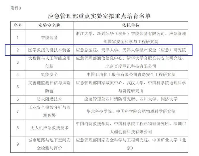 日前,由应急总医院、天津大学和天津大学温州安全(应急)研究院合作共建的“医学救援关键技术装备实验室”入选应急管理部重点实验室重点培育名单。