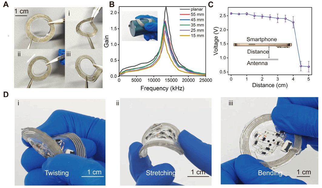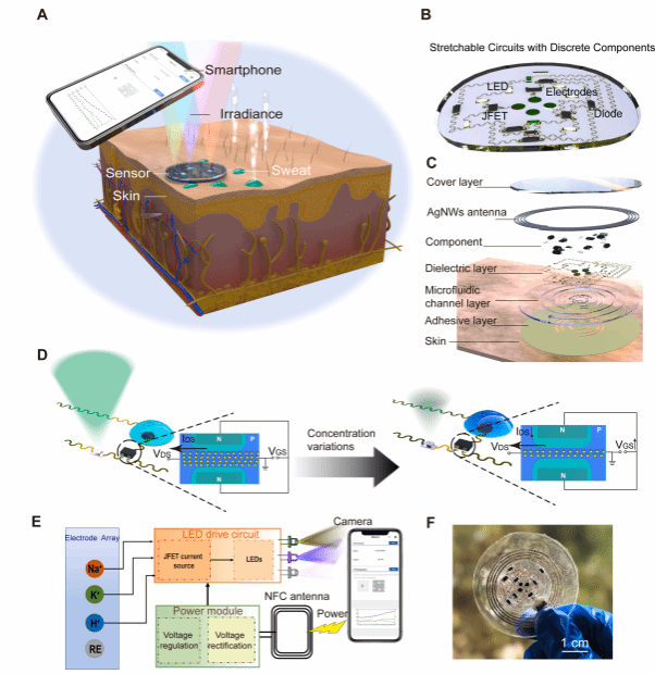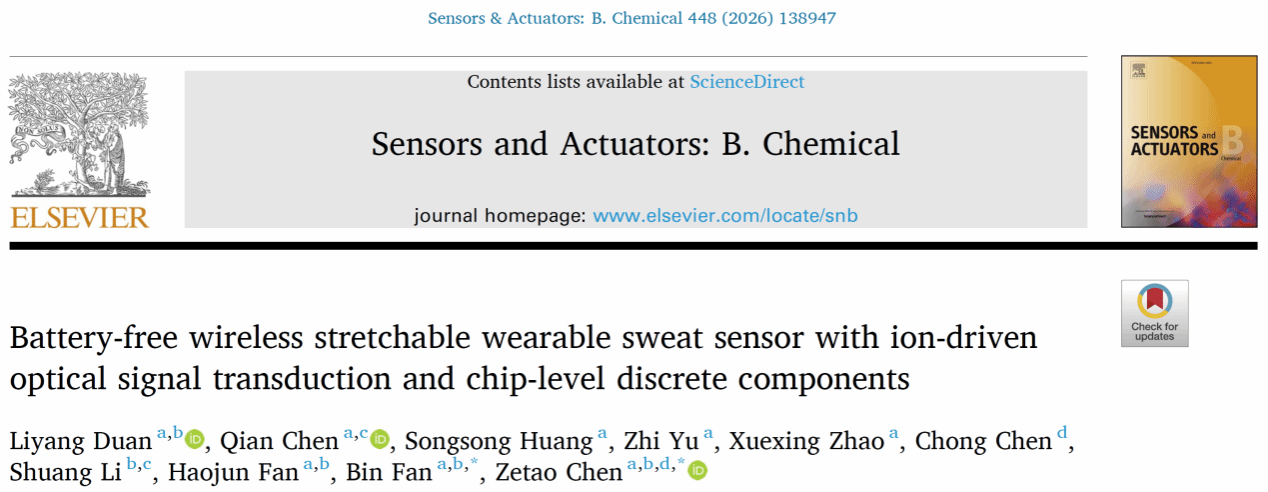 近日,我院研究团队在穿戴式传感领域取得重要进展!研究团队成功开发了一种基于离子驱动光信号传输的无线无源可拉伸穿戴式传感平台,实现多通道汗液电解质的连续检测,并通过构建智能手机算法实现检测结果的实时分析与处理,进而实现人体代谢水平的动态监测,在一定程度上促进了我国健康事业的发展。该传感平台采用分立电子元件实现无微控制芯片(MCU)设计方法,通过可拉伸材料封装,提升传感器柔性与共形属性,为穿戴式汗液电解质分析、代谢监测与健康管理提供有力的技术与工具支撑。该项研究成果以“Battery-free wireless stretchable wearable sweat sensor with ion-driven optical signal transduction and chip-level discrete components”为题在传感领域国际权威期刊Sensors and Actuators B: Chemical上发表。