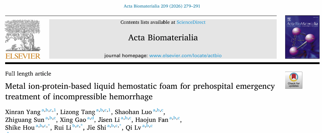 天津大学医学部卫生应急学院侯世科教授、吕琪教授、史杰讲师,以及深圳大学总医院急诊科李瑞副主任医师为本论文共通讯作者,天津大学卫生应急学院杨欣燃、唐立宗博士生为本文共同第一作者。天津大学智能生物材料与重要脏器保护团队依托国家应急管理部重点实验室,研究围绕平时急救(创伤)、灾时(地震/挤压伤+火灾爆炸/复合伤)、战时(战创伤+出血)展开智能生物材料研发。方向包括但不限于止血材料、人工血管、智能敷料、干细胞及分泌组分、组织修复替代材料等。