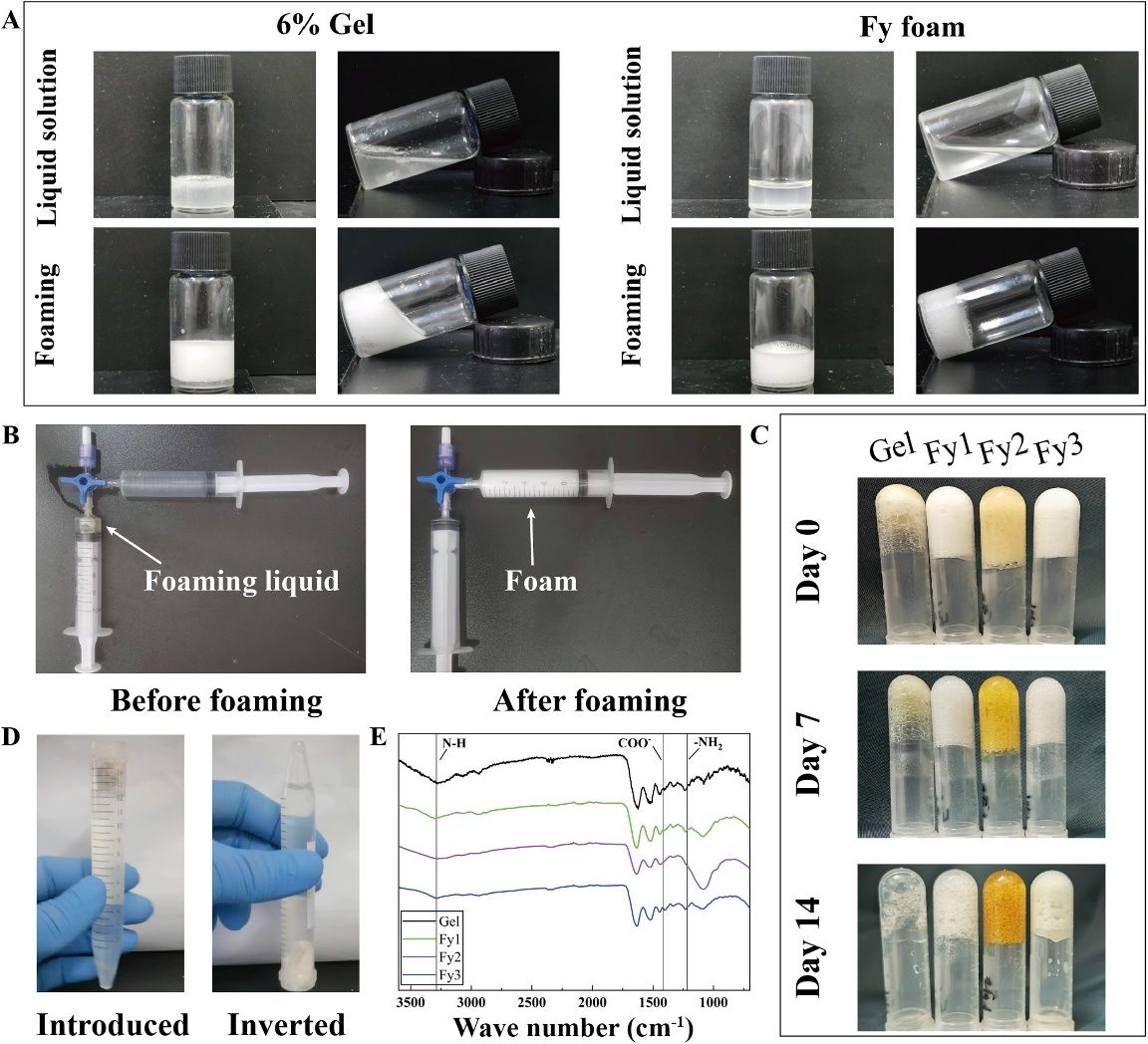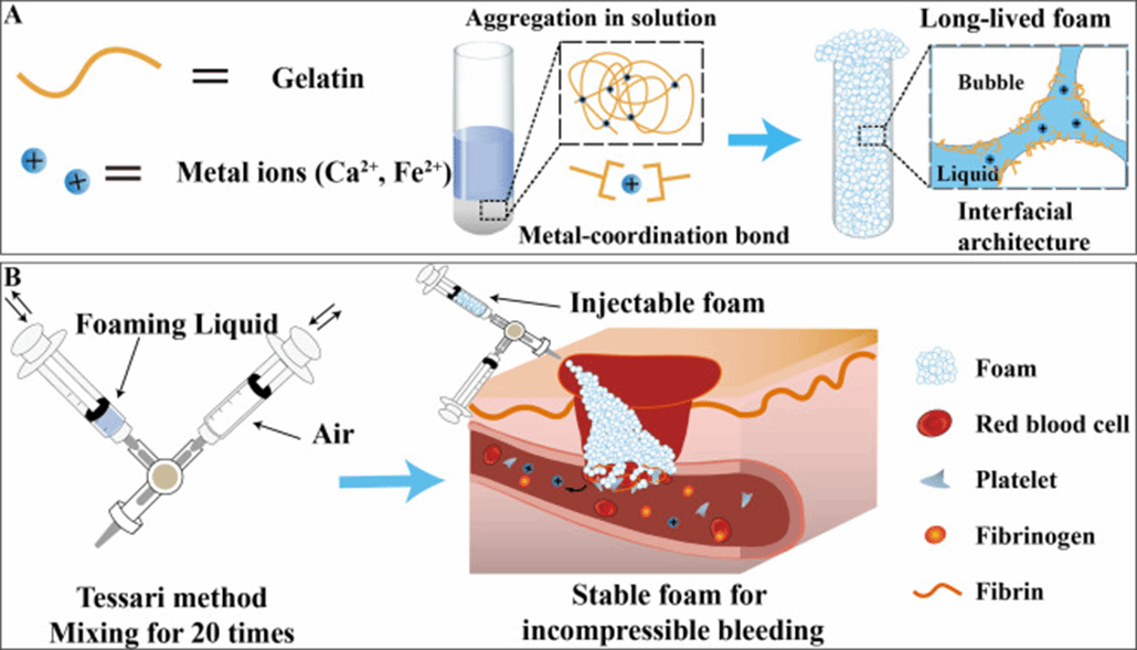 图例:(A)Fy泡沫的设计与发泡机制示意图,金属-蛋白配位键为泡沫提供了主要结构支撑。(B)通过双注射器Tessari法可以制备稳定且寿命长的泡沫。这种注射泡沫能够覆盖不规则伤口并治疗不可压迫性出血。