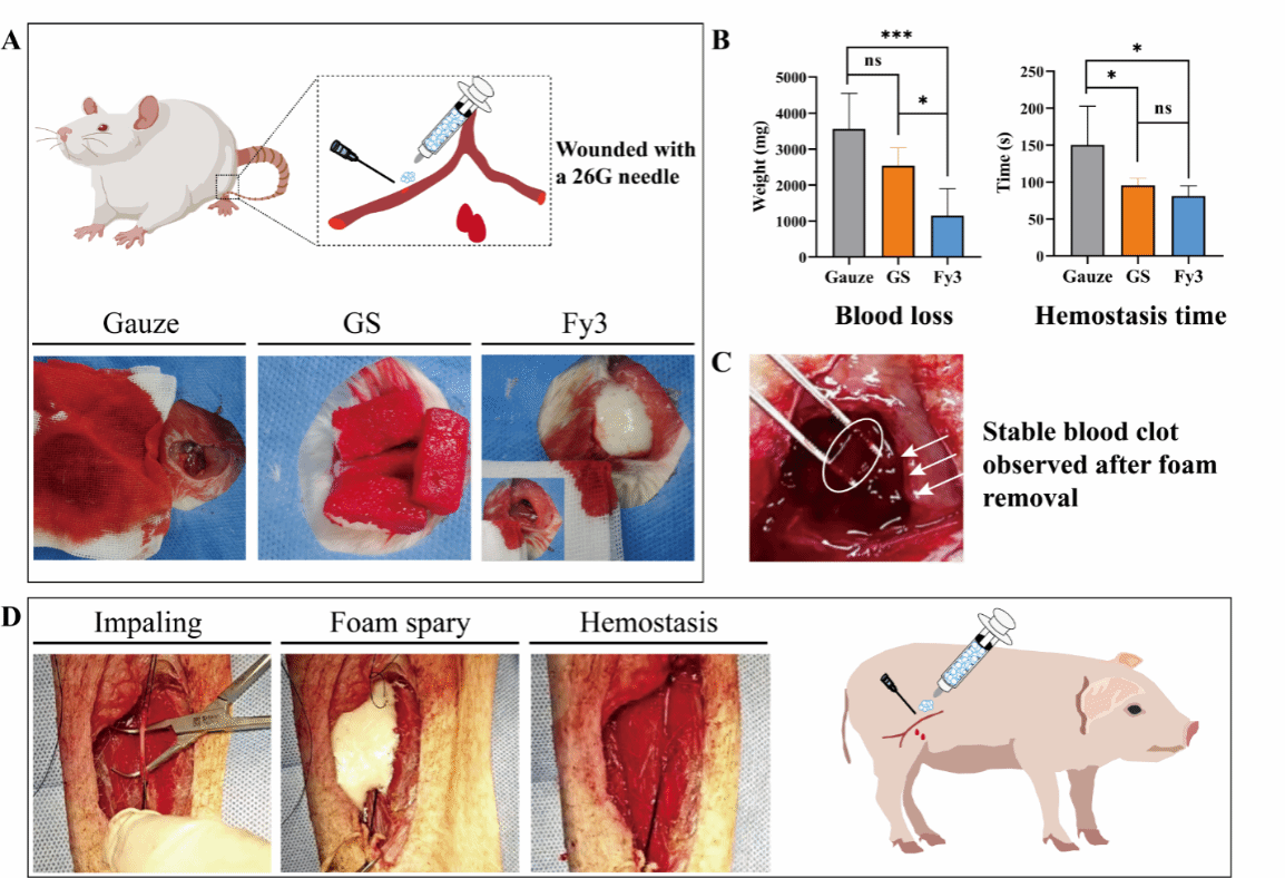 该团队设计并制备了一种液体止血泡沫,用于不可压迫性出血的院前急救。泡沫表现出较好的稳定性、机械强度和持续时间,且可以在止血后轻松从伤口中移除,不会破坏血凝块或引发继发性出血,这种特性对院前救治非常有益。