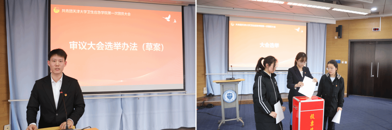 任少通宣读了《共青团天津大学卫生应急学院第一届委员会委员选举办法(草案)》《大会总监票人、监票人名单(草案)》,经全体参会人员一致通过。在主持人宣布总计票人、计票人名单后,总监票人都梓帆主持选举工作。