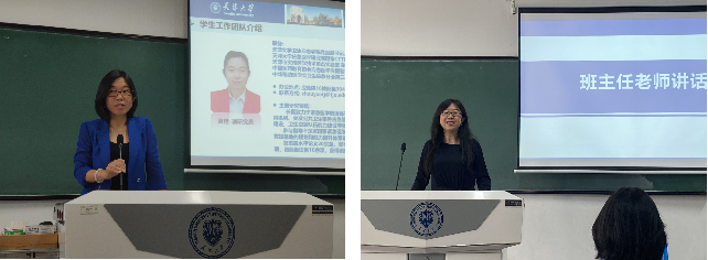 班主任张映熠结合自己出国留学的经历,分享了学习、科研、生活的经验,为新生未来的科研生活提供指导。辅导员张子阳为新生详细解读天津大学学生资助政策,希望同学们能够安心求学,立天大志成天大事圆家国梦