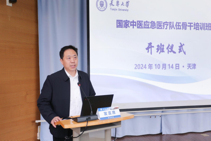 10月14日上午9:00,开班仪式在天津大学卫津路校区会议楼举行,天津大学卫生应急学院院长樊毫军主持开班仪式,国家中医药管理局医政司副司长邢超,国家中医药管理局医政司医疗管理处处长王瑾,天津市卫生健康委员会党委委员、副主任于春泉,天津市卫生健康委员会中医医政处处长律扬,天津大学副校长明东,天津大学卫生应急学院名誉院长、天津大学温州安全(应急)研究院院长侯世科,天津大学卫生应急学院党委书记庞博,天津大学卫生应急学院党委副书记、副院长周艳,天津大学卫生应急学院副院长赵艳梅,天津大学温州安全(应急)研究院副院长唐冠义出席。