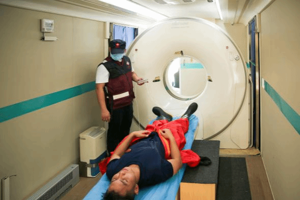 冷区救援:国家紧急医学救援队(海南)接到温区传递的伤员信息后,根据检伤和温区处置情况,快速分配至移动医院的相应功能区域。移动医院内功能齐全,涵盖了多个医疗单元,能满足不同伤病员的救治需求。医护人员将温区标识为红色、黄色的疑似颅内损伤、胸腹部创伤的伤员有序引导至 CT 车,快速完成扫描检查,为精准诊断和后续治疗提供了有力依据。