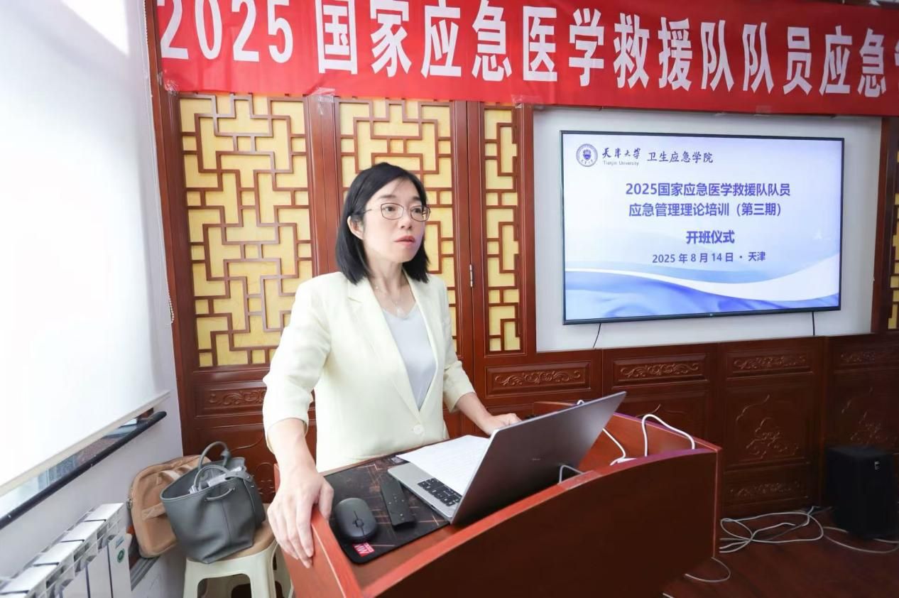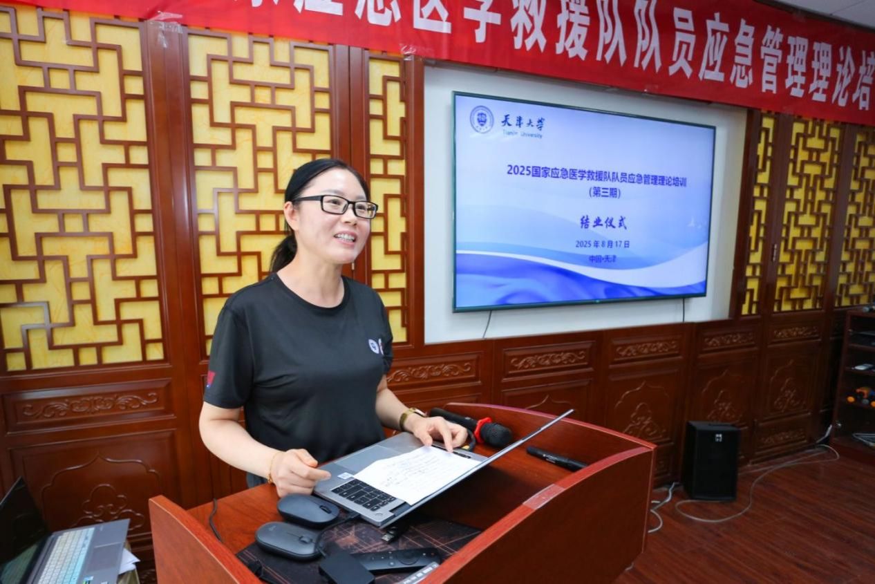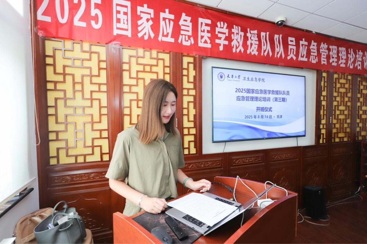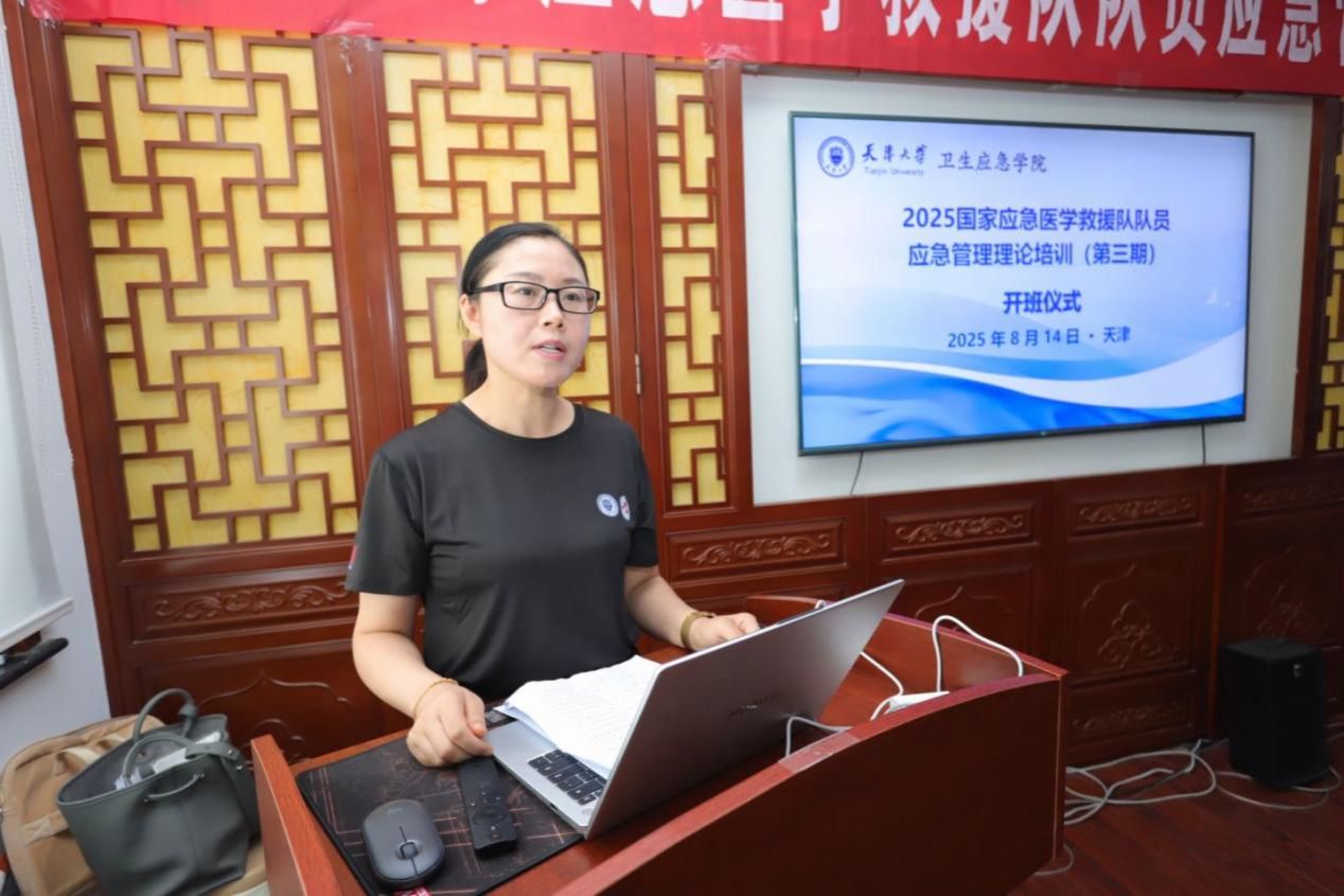 开班仪式在天津大学医学部卫生应急学院举行。仪式由天津大学卫生应急学院培训四中心刘珈因主持,她首先介绍了本次培训的整体安排与核心目标,为仪式拉开序幕。随后,天津大学卫生应急学院党委副书记、副院长周艳发表致辞,她代表学院对来自全国各地的学员表示热烈欢迎,同时结合当前的救援形势,强调了应急医学救援人才能力提升的重要性,寄语学员珍惜学习机会,将理论知识转化为实战能力。