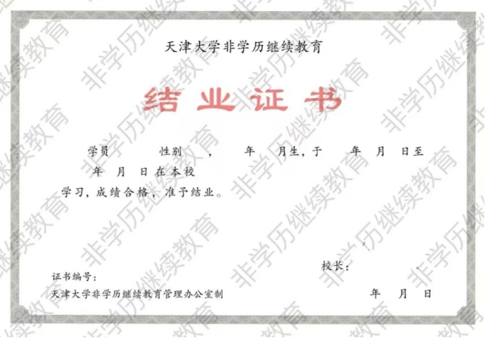 1.结业证书:成绩合格颁发天津大学非学历继续教育结业证书(加盖天津大学钢印)