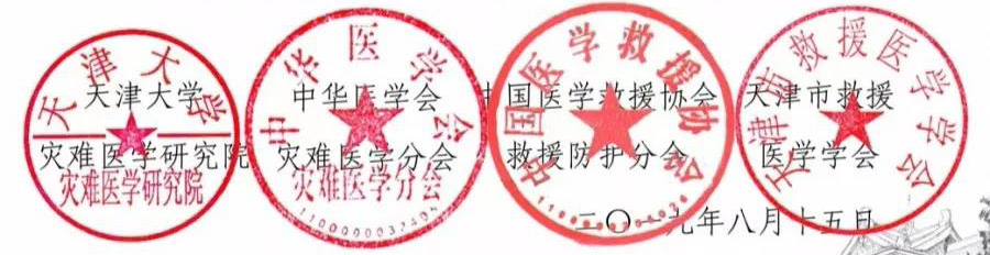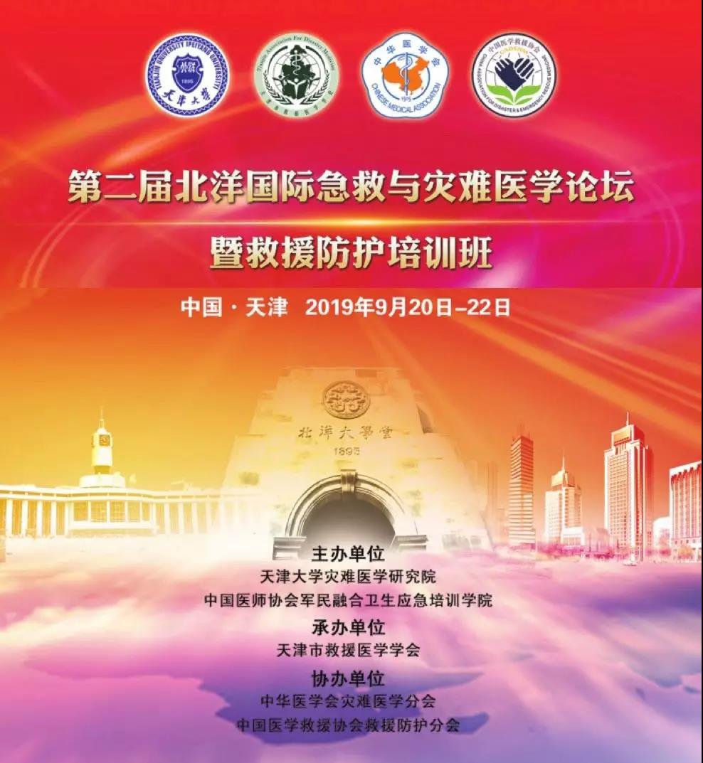 在此背景下,2017 年 6 月天津大学灾难医学研究院正式获批成立,我们提出以“融合、发展、创新、规范”为主旨,以夯实医护人员灾难医学理论技术,最大限度减少突发事件现场人员伤亡为目的,2018 年 10 月组织召开了“第一届北洋国际急救与灾难医学论坛”,取得良好效果。为更好的落实国家卫生应急“十三五”规划要求,助推我国急救与灾难学科建设发展,进一步提升广大医务工作者急救灾难技术水平,拟定于 2019 年9 月 20 日-22 日,在天津召开“第二届北洋国际急救与灾难医学论坛暨救援防护培训班”。